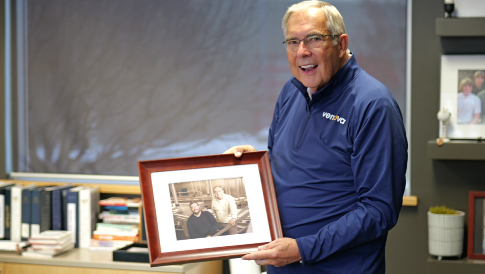 Jim Dean, Versova CEO, reflects on a photo with his son, JT Dean, Versova President, at the Center Fresh Breaking Plant 20 years ago.